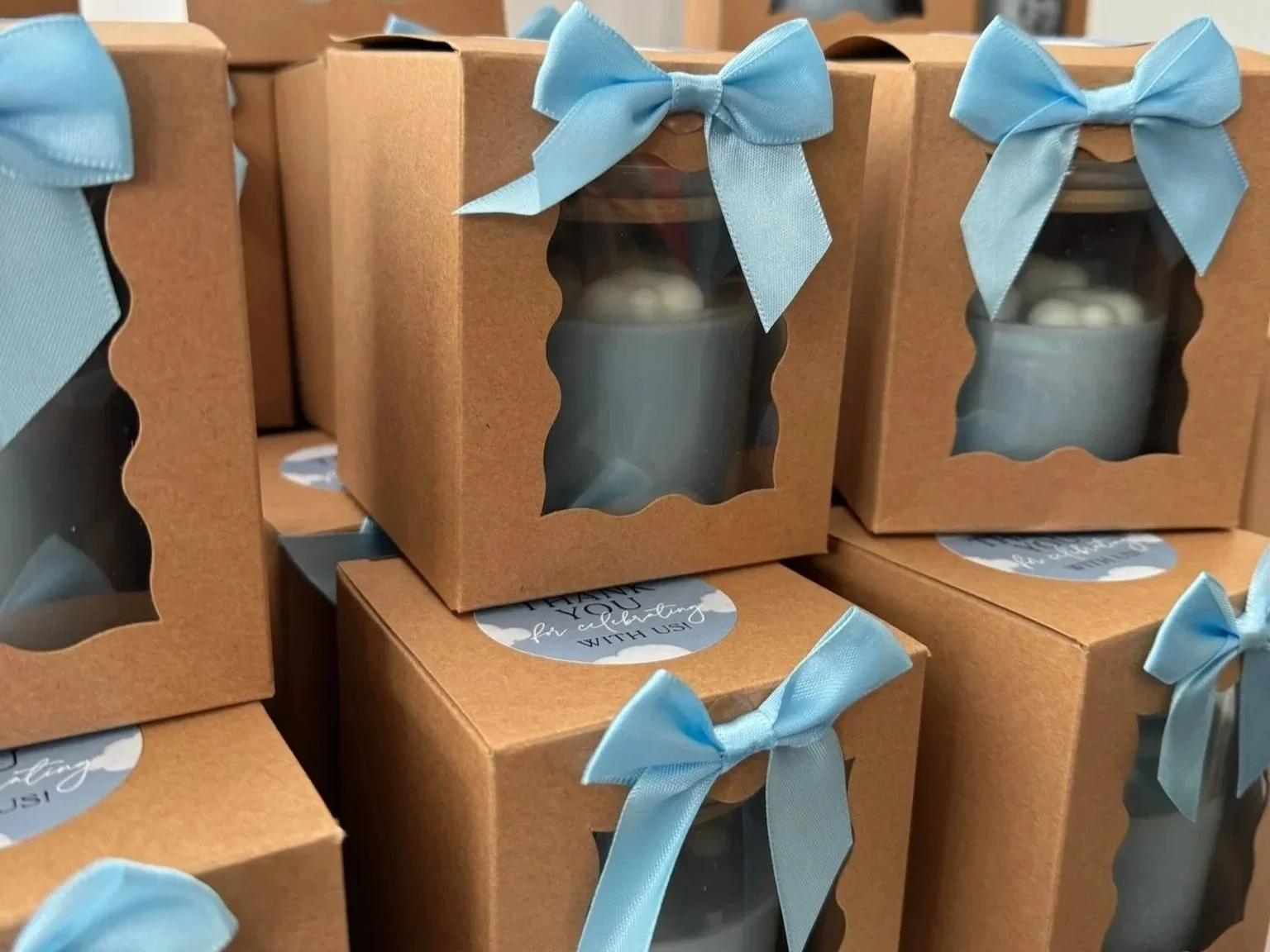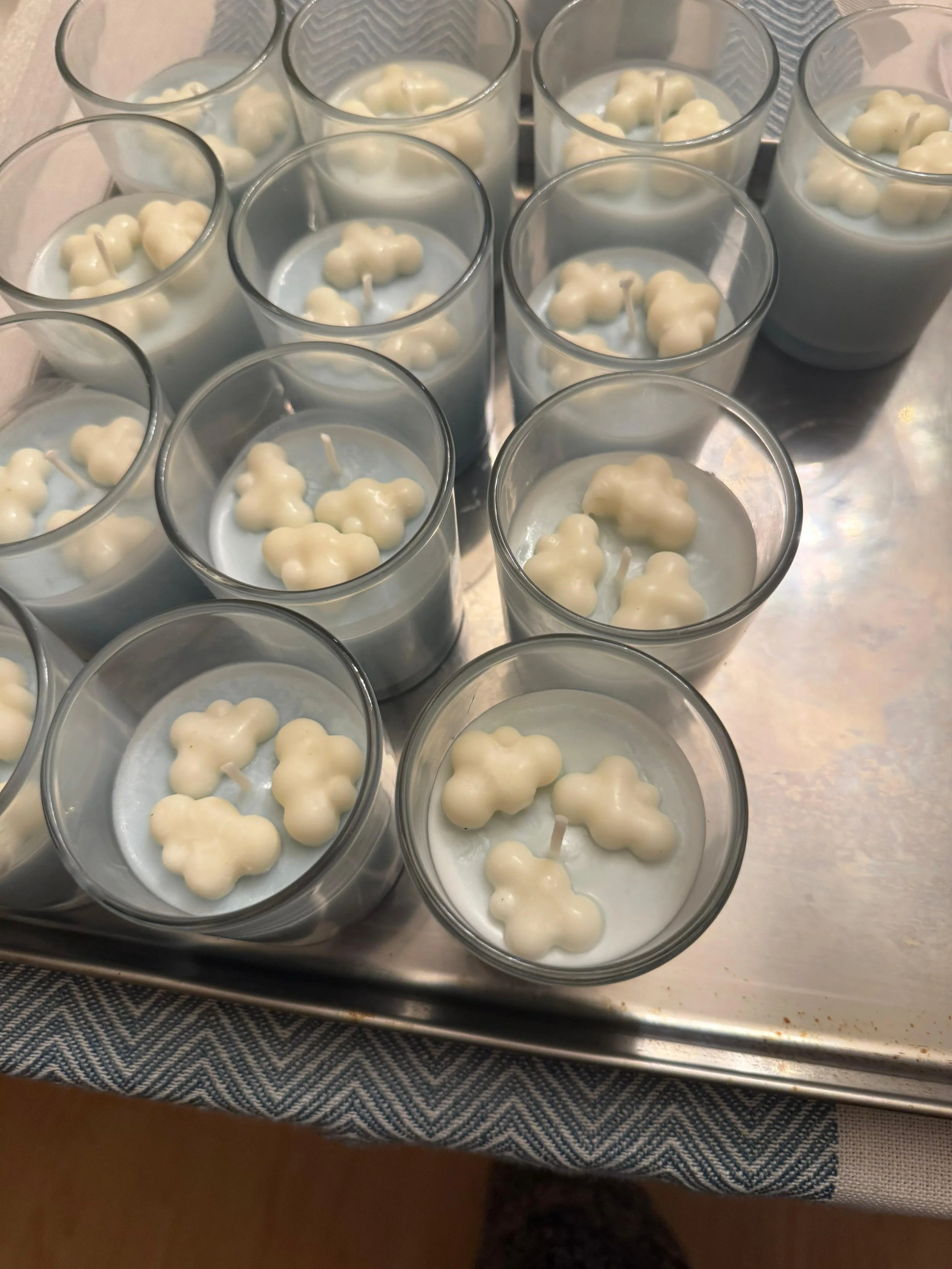 Anjana immediately dove into the creative process. She started experimenting with color, testing different dyes and blends until she landed on the exact shade of sky blue they were imagining. Achieving the perfect tone took patience and plenty of trial and error, but the result was worth every iteration. To bring the theme to life, she searched for and sourced specialty molds that would let her top each candle with three tiny cloud embellishments.
