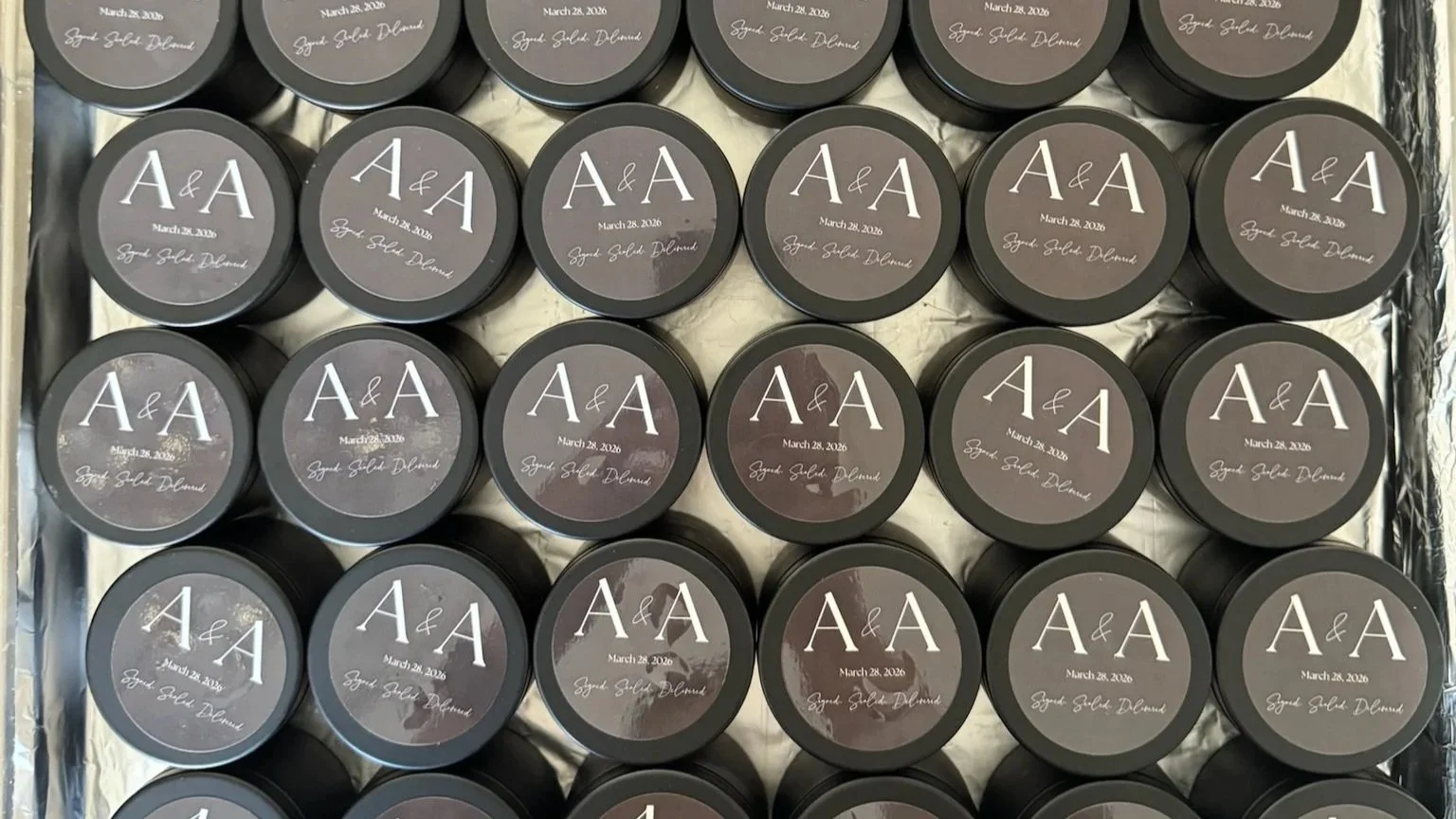 Each tin was finished with a unique label: the couple's initials, the date, and Signed, Sealed, Delivered. White script on dark background, simple layout. It turned a candle favor into something truly custom for this special occasion.