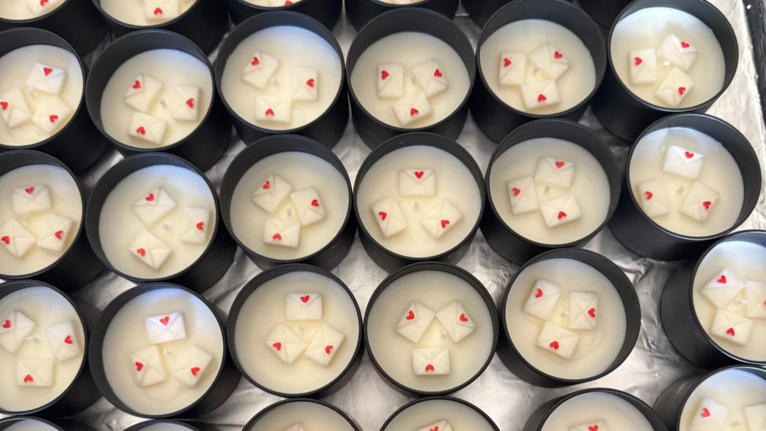 The moment Anjana heard "they met at a post office," the direction was clear. The challenge was translating that into something that felt genuinely elegant. They explored postal-themed imagery - stamps, mailboxes, letters - before landing on a miniature wax envelope mold with a small red heart at the center. It was the perfect touch of customization to the candles.